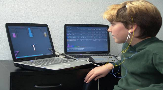 In a session of neurofeedback, the patient sits with electrodes attached to the scalp and ears and wired to a computer. By concentrating deeply, he/she can control the wavy lines produced by the brain’s electrical activity on a monitor.